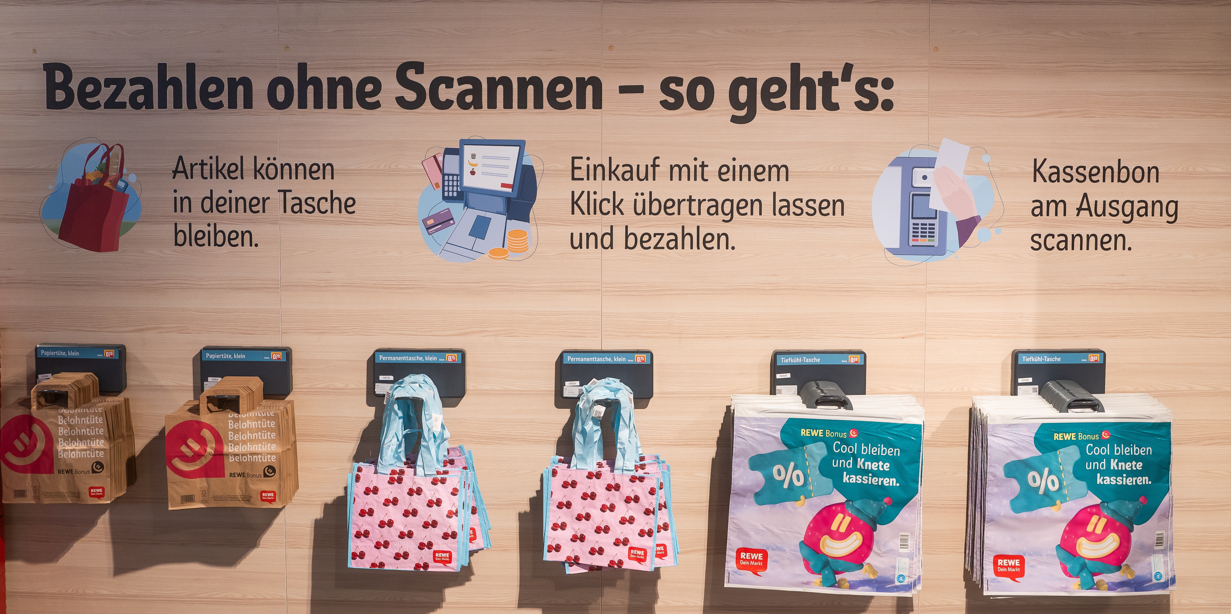 Im Testmarkt funktionieren das Einkaufen und Bezahlen ohne zu scannen über Kamera- und Sensortechnologie. Dafür arbeitet REWE mit Trigo Vision Ltd. zusammen, einem auf Computer-Vision-Technologie spezialisierten Unternehmen. Die Lösung von Trigo erstellt ein 3D-Modell eines Supermarktes, um die Umgebung und Bewegungen darin digital abzubilden, so dass die Kund:innen Artikel auswählen und auch wieder zurücklegen können. Datenschutz ist dabei von zentraler Bedeutung: Die von Kundinnen und Kunden erfassten Bildaufnahmen werden datensparsam verarbeitet und dienen ausschließlich dazu, den Einkauf ohne Scanvorgang zu ermöglichen. Das System erfasst ausschließlich Daten, um zu erkennen, welche Produkte entnommen bzw. zurückgelegt werden.