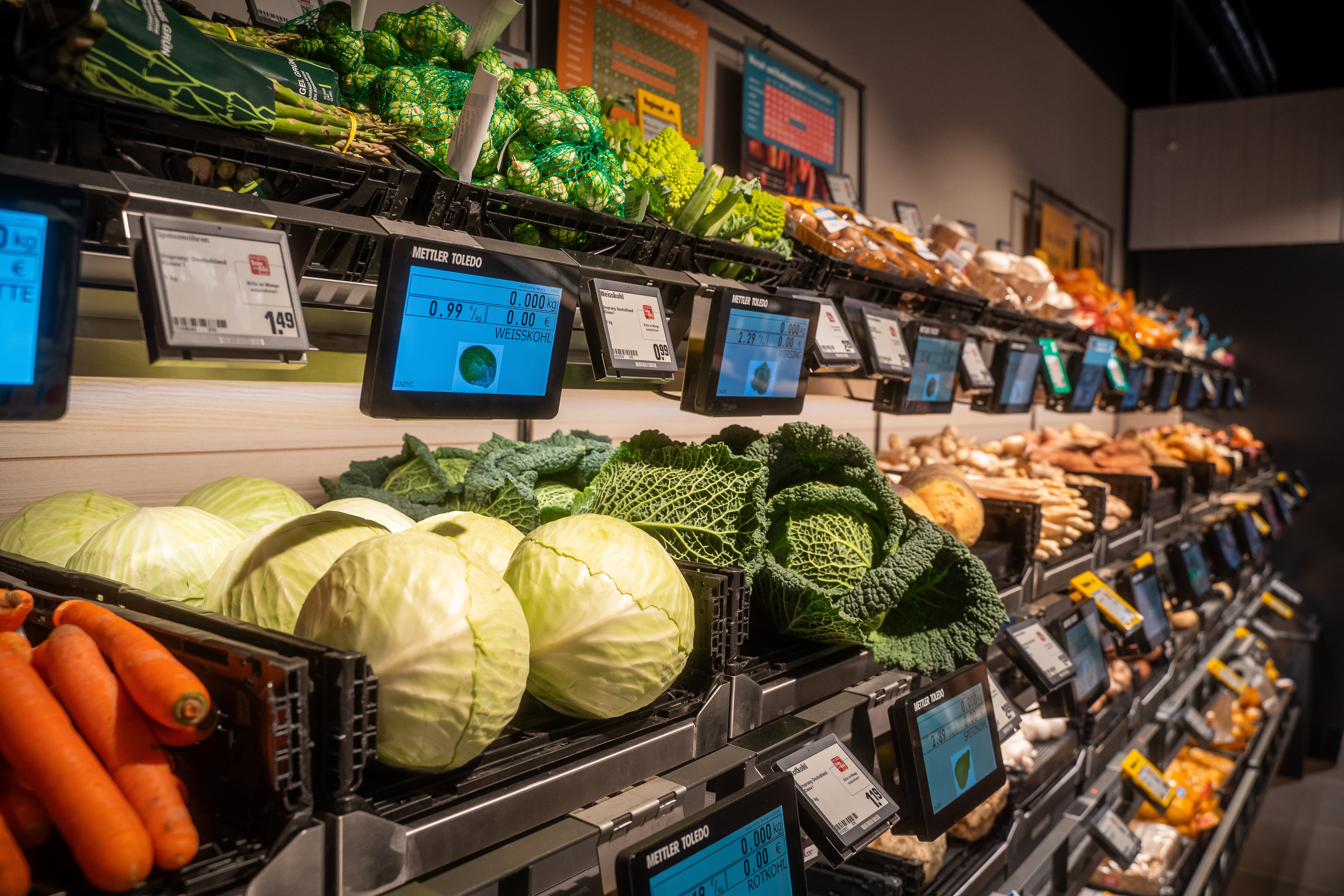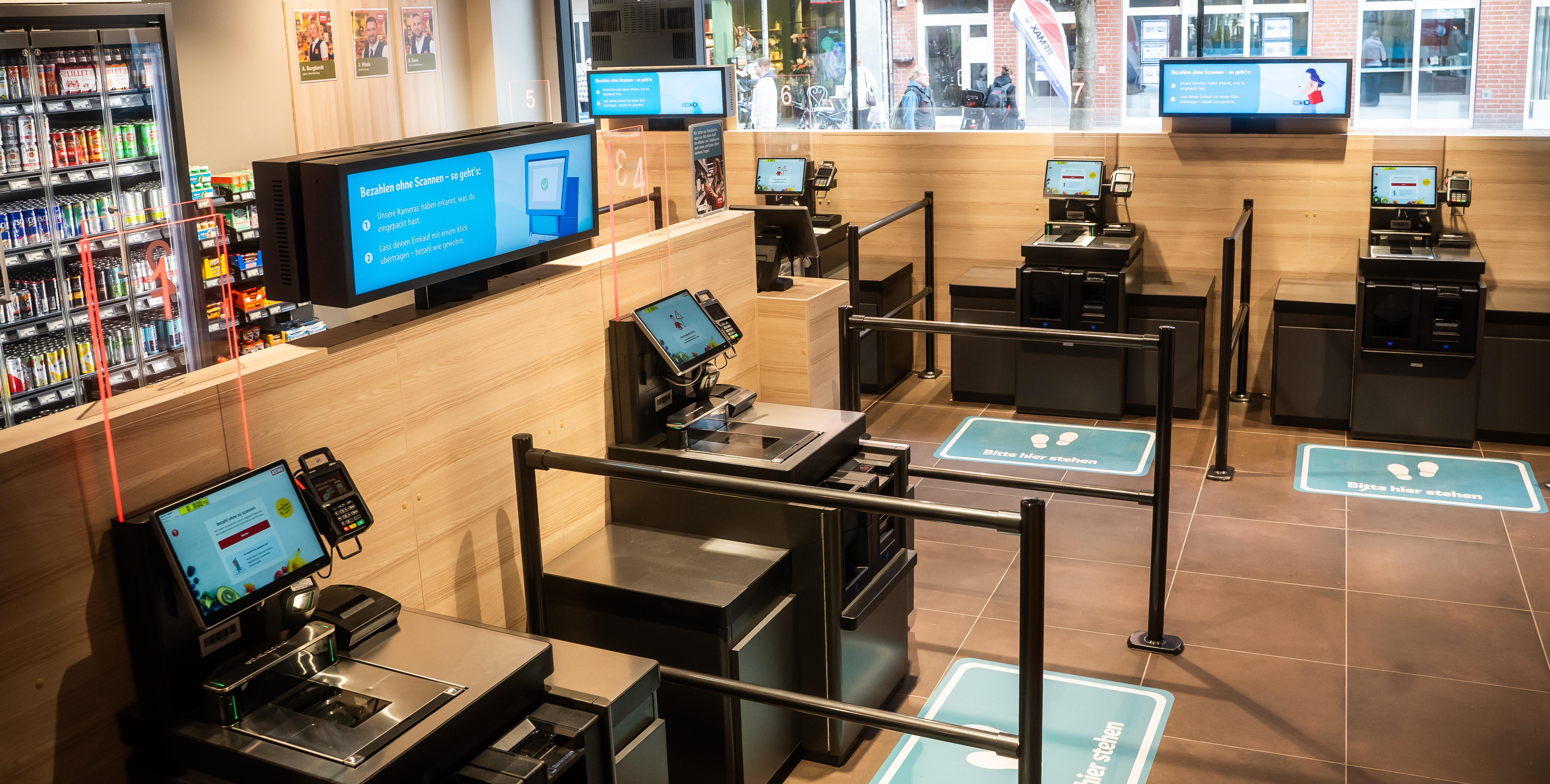 Im Testmarkt in Hannover haben Kund:innen die Möglichkeit, mit der sogenannten Scanless-Methode zu bezahlen: Dabei kaufen Kund:innen wie gewohnt ein und legen die ausgewählten Produkte in den Einkaufskorb oder in ihre mitgebrachten Einkaufstaschen. Anschließend gehen sie zu einem der acht Bezahlterminals, drücken auf dem Monitor vor sich auf „Start“ und die Liste mit ihren eingekauften Produkten erscheint auf dem Display. Kund:innen können dann entscheiden, ob sie bar oder per Karte bezahlen.